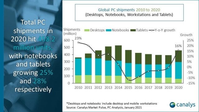 The Global PC market (including tablets) ended 2020 on a high, posting a third consecutive quarter of annual growth as shipments hit 143.7M units in 4Q20, up 35% year-on-year. As a result, total shipments for 2020 grew 17% to reach 458.2M units, the highest volume since 2015. Lenovo led the market in 4Q20 and for the full year, with shipments of 28.8M and 87.0M units, respectively. (GSM Arena, Canalys, CN Beta)