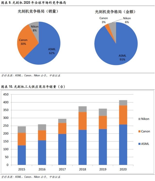 According to BOCI Securities, of the 413 lithography machines in 2020, 258 units from ASML accounting for 62%, 122 units (KrF, i-line) from Canon accounting for 30%; and 33 from Nikon accounting for 8%. In terms of sales, the sales of lithography machines of ASML, Canon, and Nikon accounted for 91%, 3%, and 6%, respectively. (BOCI Securities report)