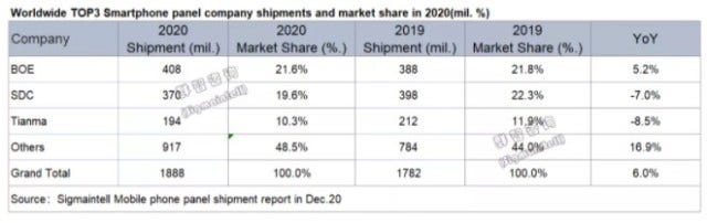 According to Sigmaintell, in 2020 the total shipment of global smartphone panel is 1.888B units, representing a YoY increase of 6%. BOE ranks as the world’s №1 panel manufacturer with 408M units shipped during the period. Thus, the Chinese firm controls a 21.6% share of the market, a YoY increase of 5.2%. Samsung Display and Tianma ranked second and third with shipments of 370M and 194M, respectively. (Gizmo China, Sigmaintell, press)