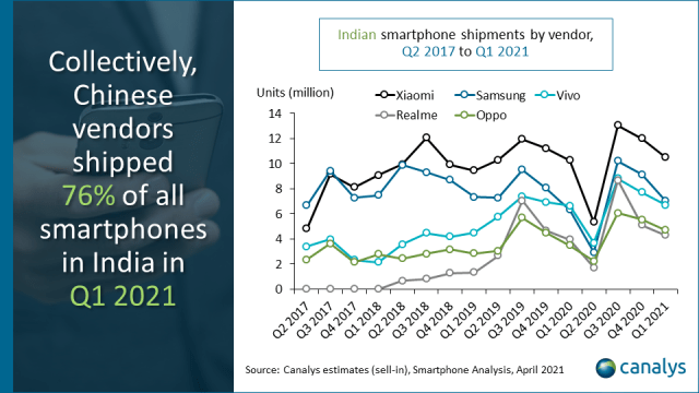 According to Canalys, smartphone shipments in India grew 11% in 1Q21, to 37.1M units, as favorable macroeconomic factors helped smartphone vendors capitalize on the growing importance of smartphones for remote education for Generation Z and for work and leisure for Millennials. Xiaomi retained its position as the market leader, with its 10.5M shipments accounting for a 28% share. (Laoyaoba, Canalys)