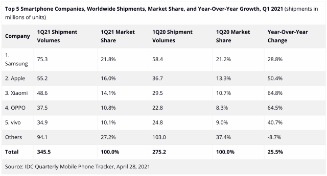 In 1Q21, worldwide smartphone shipments reached 347M units, up 27% YoY. Samsung took first place, shipping 76.5M to take a 22% share. Apple shipped 52.4M iPhones, to take a 15% share. Xiaomi clocked its best single-quarter performance ever, growing 62% and shipping 49.0M units. (Canalys, GSM Arena)