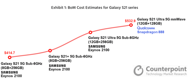 Producing Samsung’s 128GB Galaxy S21 Ultra mmWave smartphone costs Samsung up to USD533, around 7% less compared to the Galaxy S20 Ultra 5G, according to the latest bill of materials (BoM) analysis by Counterpoint Research. The Galaxy S21 series has an optimized cost structure with the models’ cost USD400–600. (Phone Arena, Counterpoint Research)
