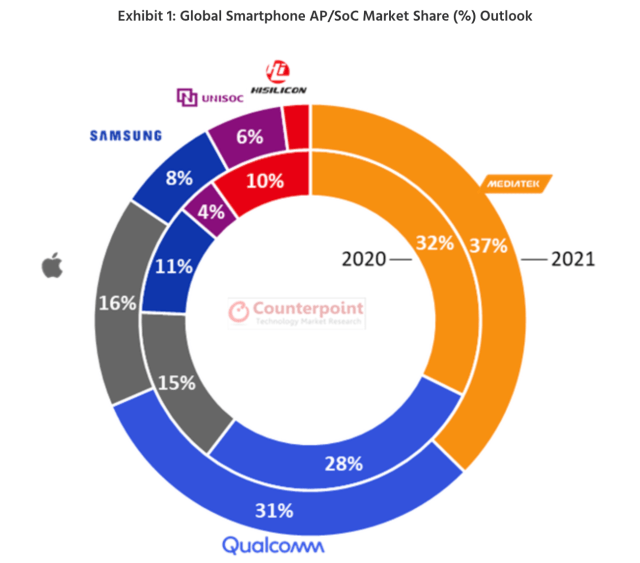 According to Counterpoint Research, global smartphone AP (Application Processor) / SoC (System on Chip) chipset shipments will grow 3% YoY in 2021, factoring in the impact of supply constraint, rapid growth of 5G smartphones and related competitive dynamics. MediaTek is likely to continue its 4Q20 momentum into 2021 and likely to capture 37% unit share of all the smartphone AP / SoC shipped for the full the year. They also estimate Qualcomm to increase its 5G SoC market share to grow to 30% mark in 2021, with 5G solutions across the tiers, from Snapdragon 8-series down to 4-series. (Laoyaoba, Counterpoint Research)
